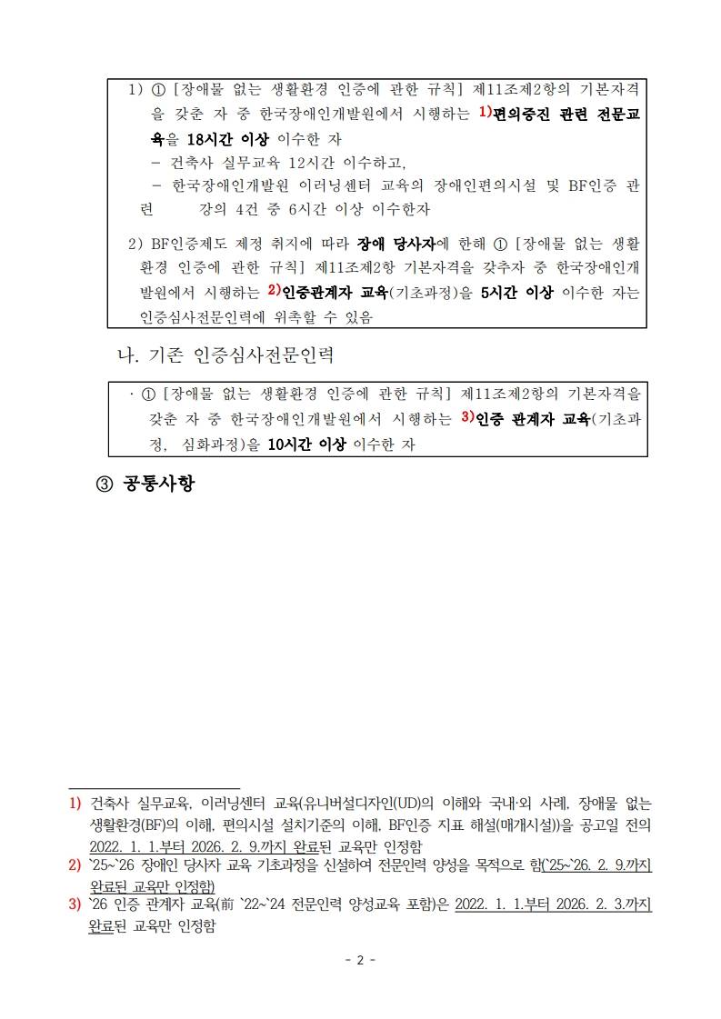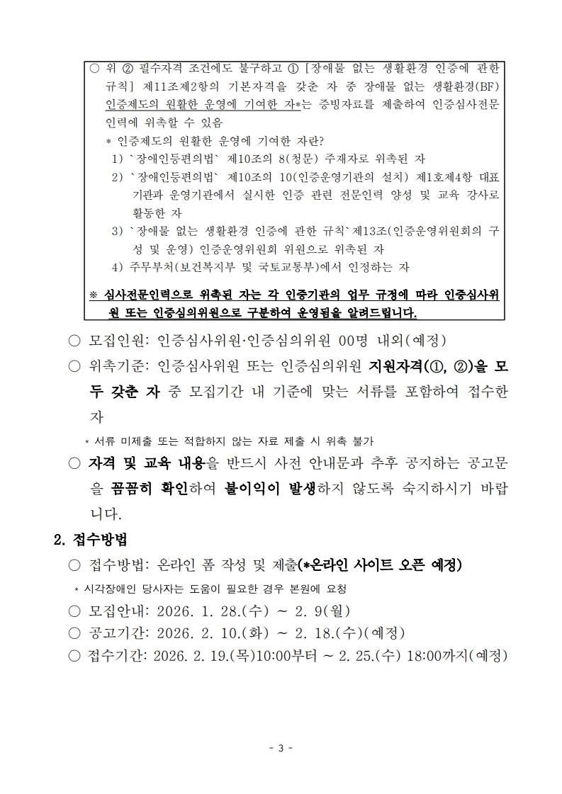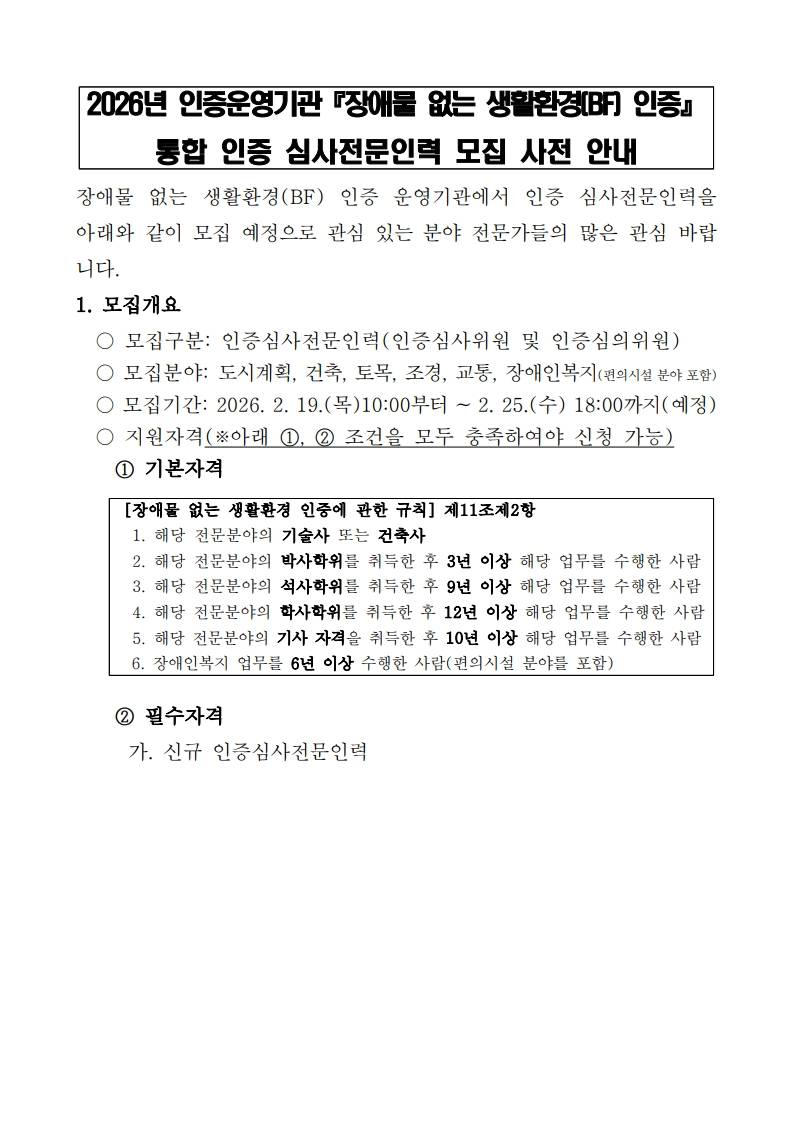 2026년 「장애물 없는 생활환경(BF) 인증」 통합 인증 심사전문인력 모집 사전 안내